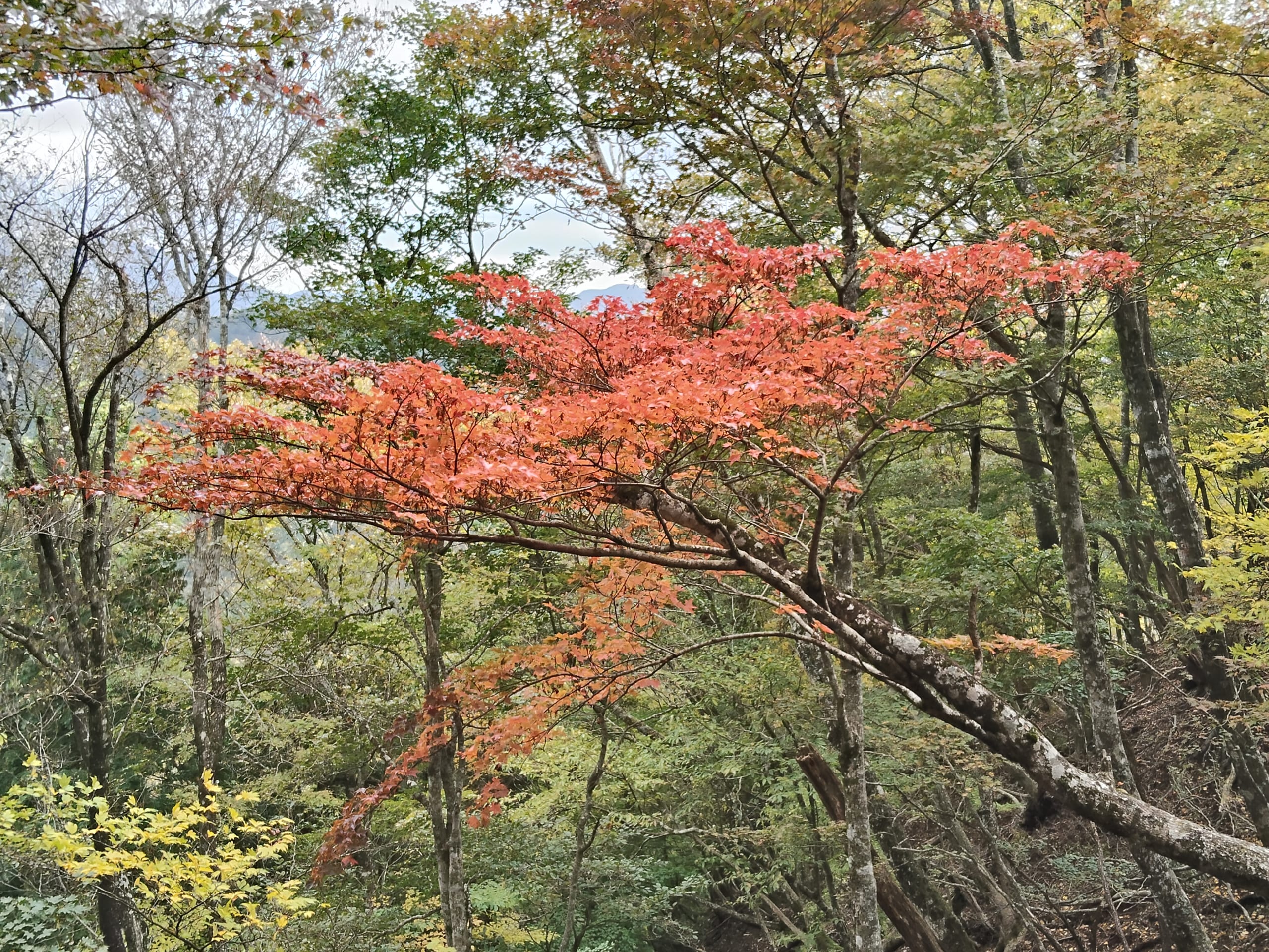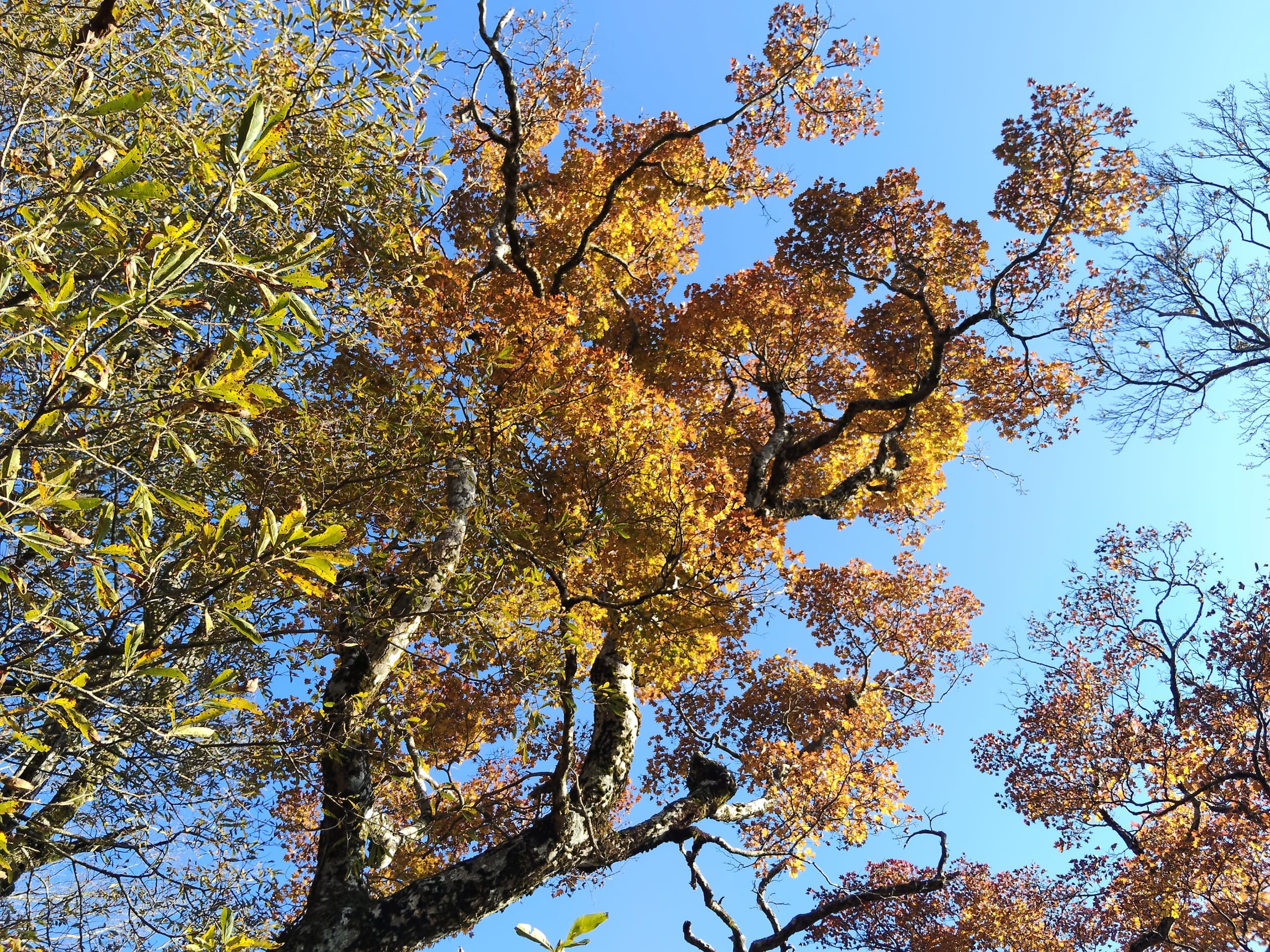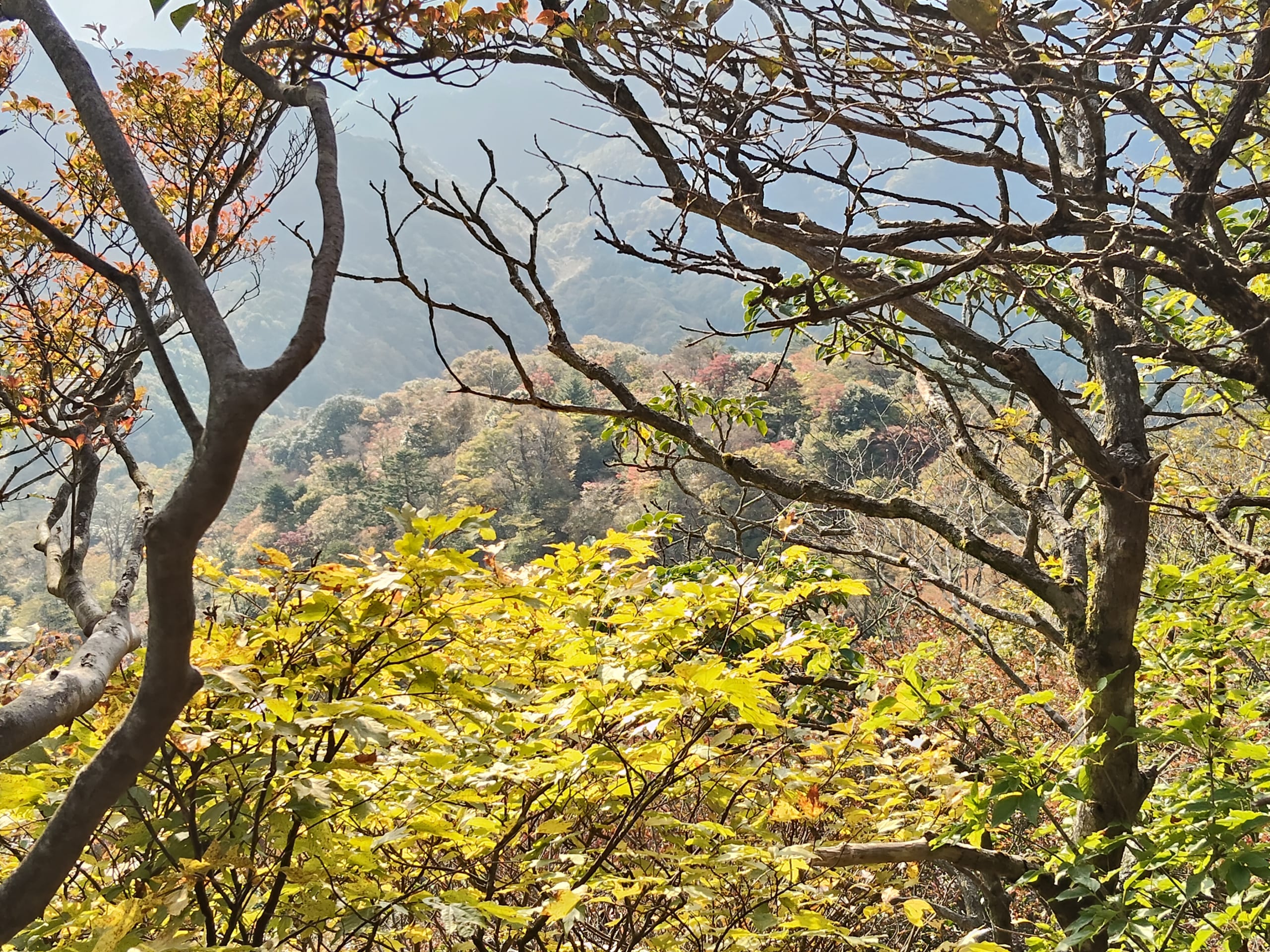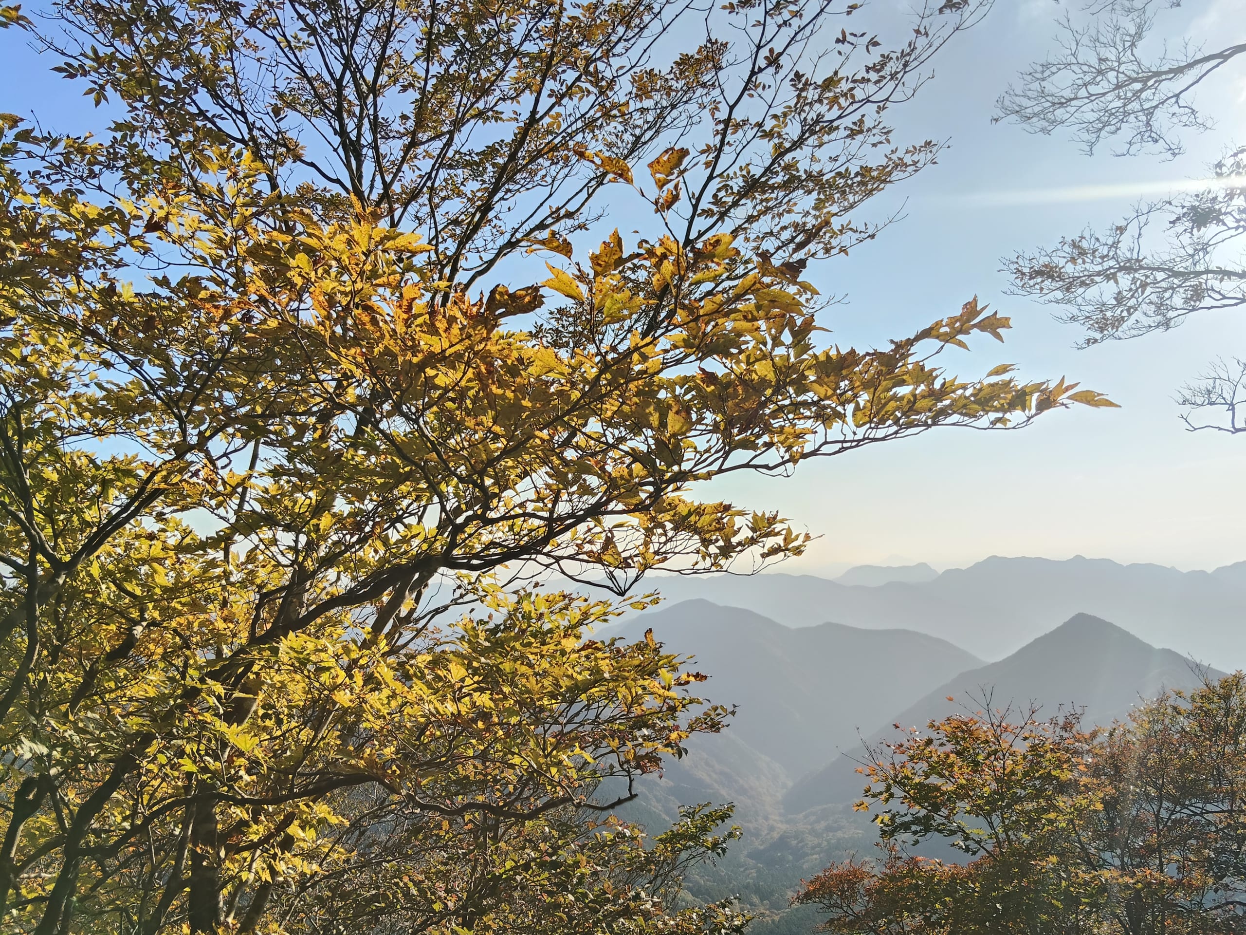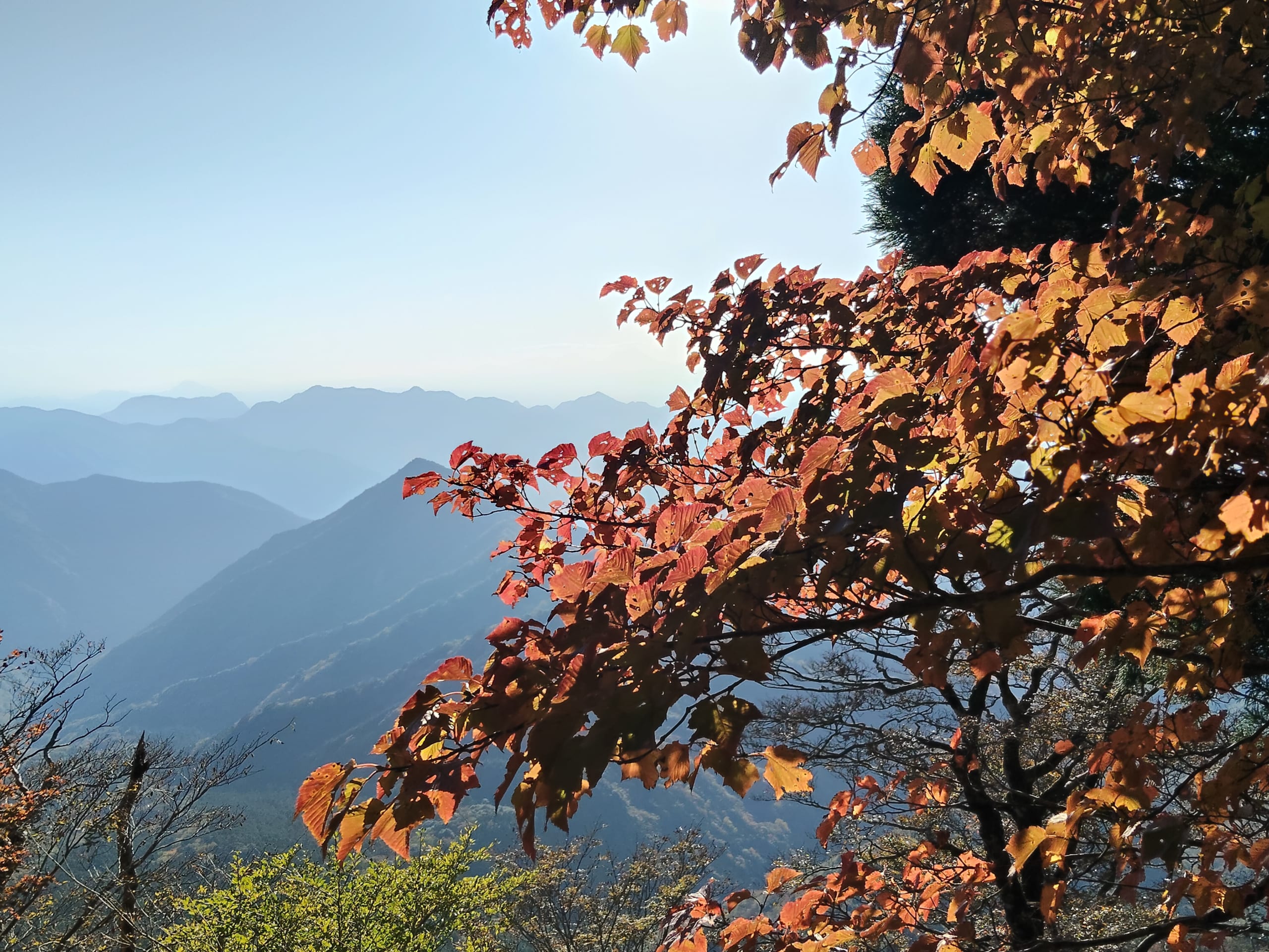 北岳の尾根まで登ると木々の紅葉🍁が朝日に