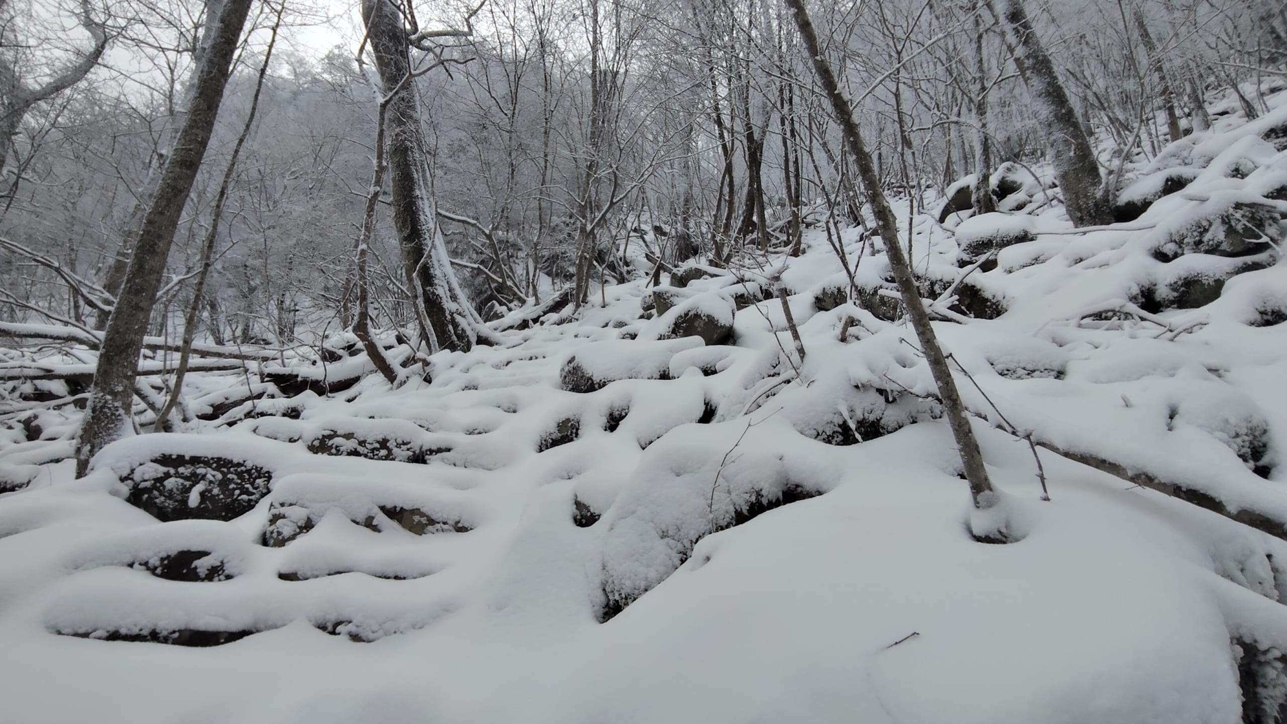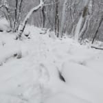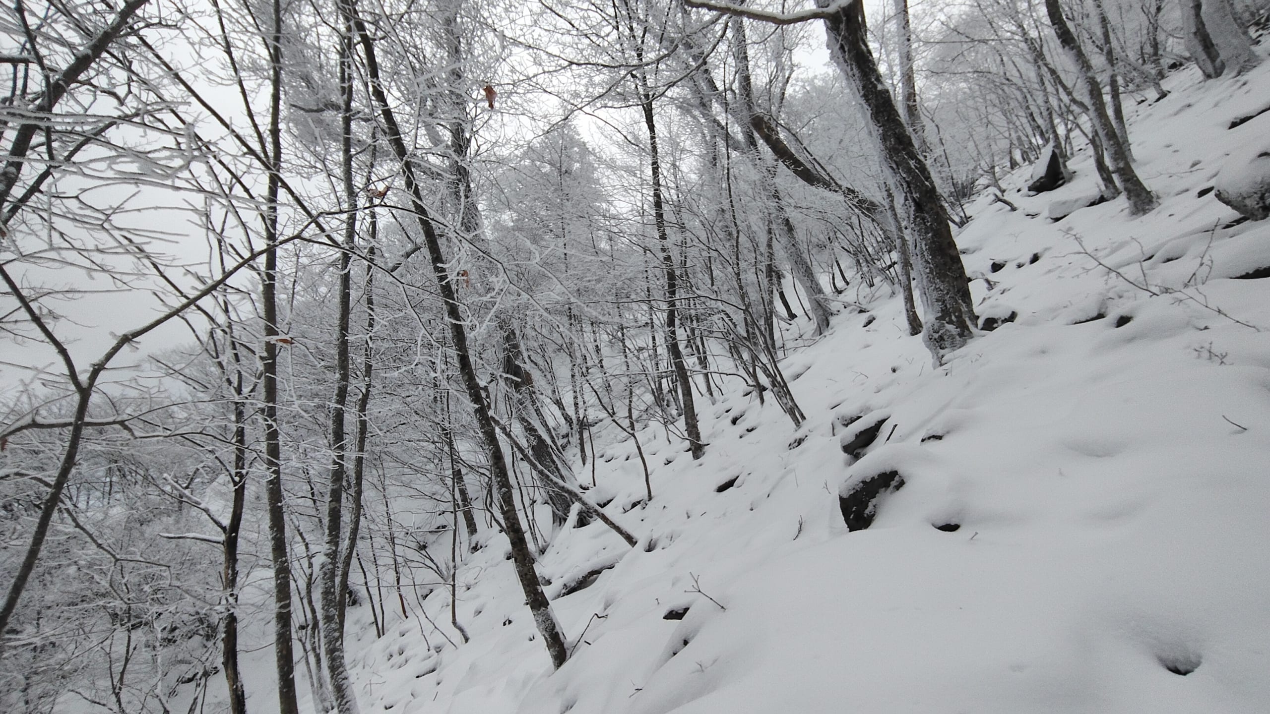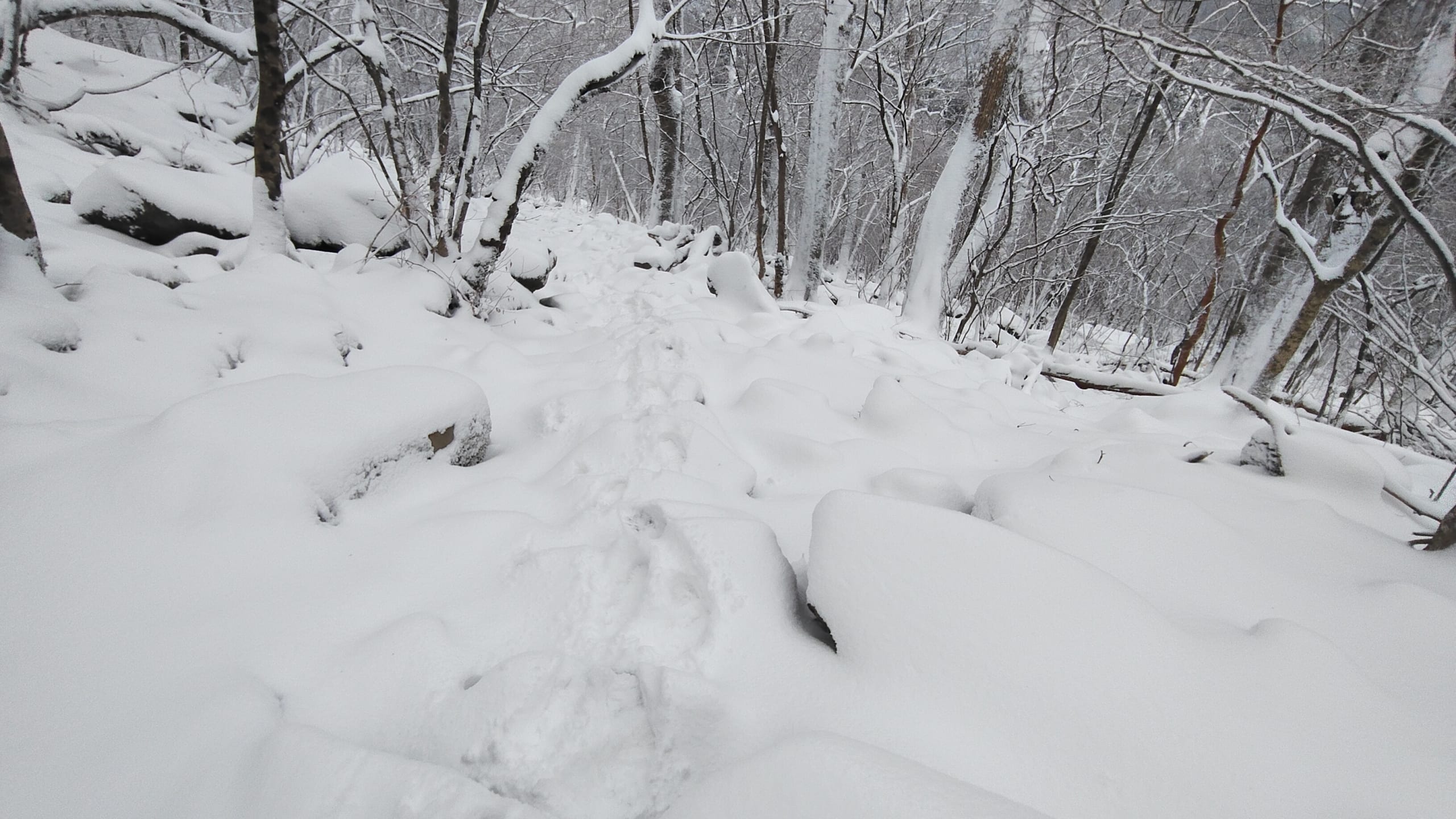 7時過ぎに登山開始。かなり降雪があったのでもちろんトレースはありません。2週間前に登ったコースを思い出して少しずつ進んで行きます。雪の下が見えないのでかなり危ないです💦